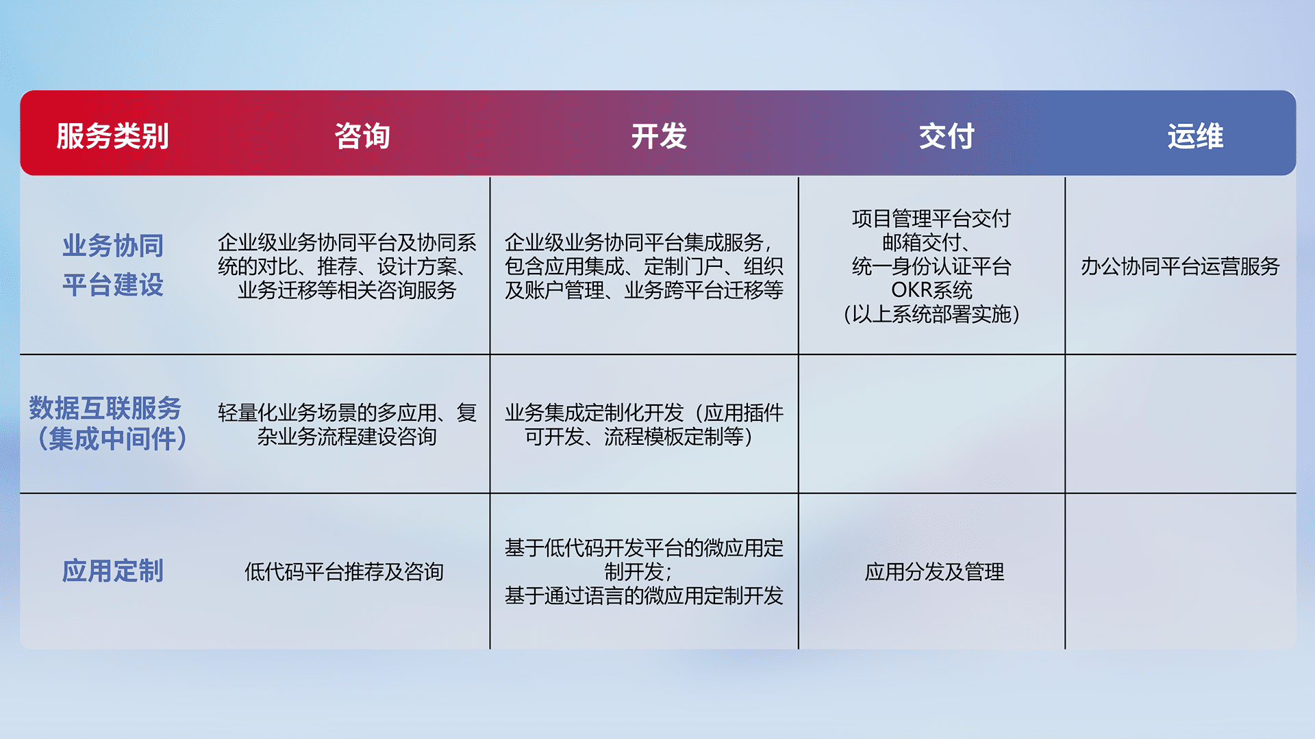 针对钉钉、、企微、、、、IDaas等平台级产品提供产品的规划、、、方案、、、交付、、、定制化开发等服务,,,,实现如统一协同办公、、、、智能客户服务、、、混合会议管理、、智能数据查询、、等业务场景,,,,实现数字化转型。。