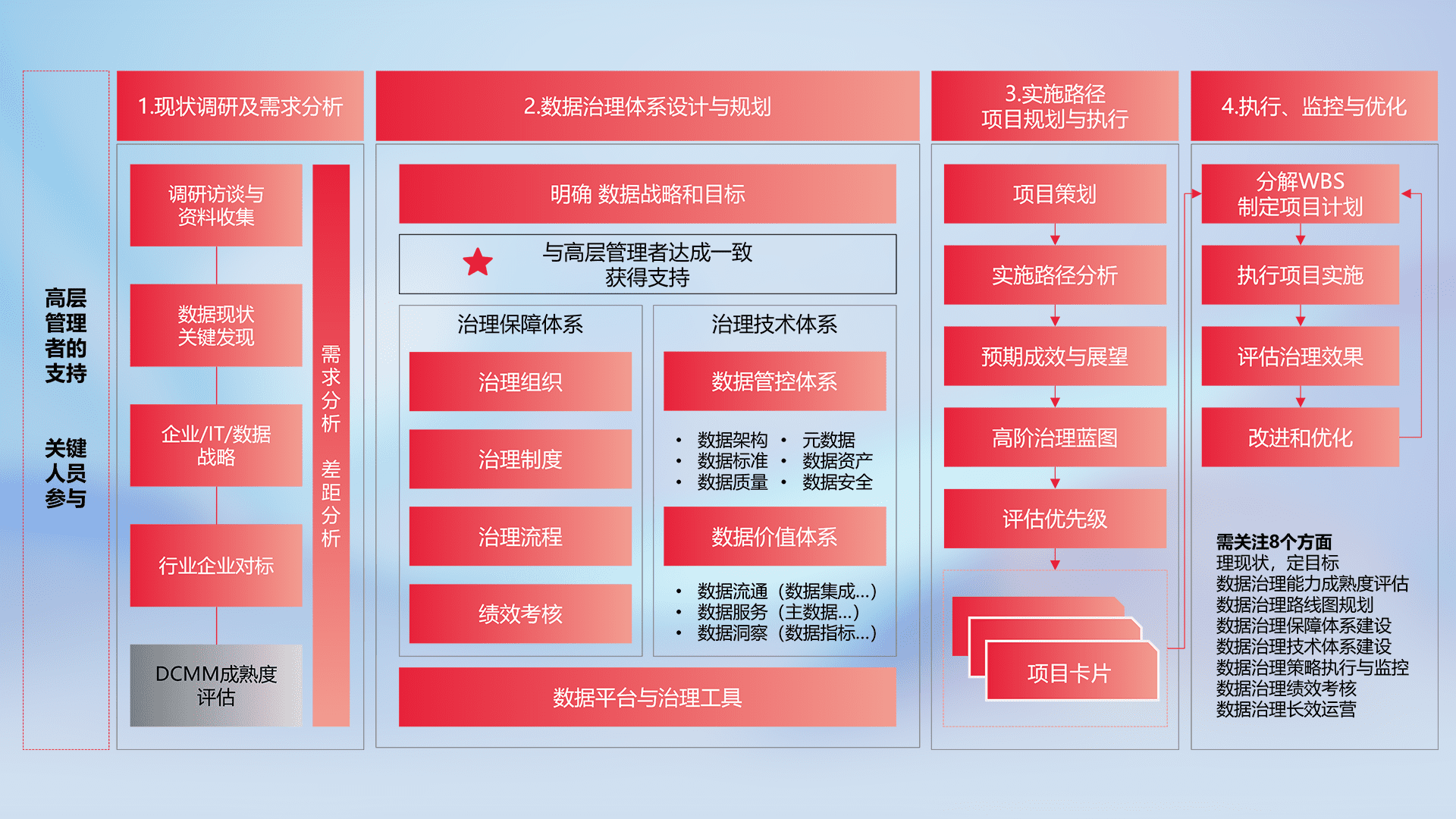 制定并执行统一的数据标准,,,规范数据定义和格式,,,,消除冗余和不一致性,,,实现跨部门和跨系统的数据一致性,,,,为企业提供标准化的数据基础。。。